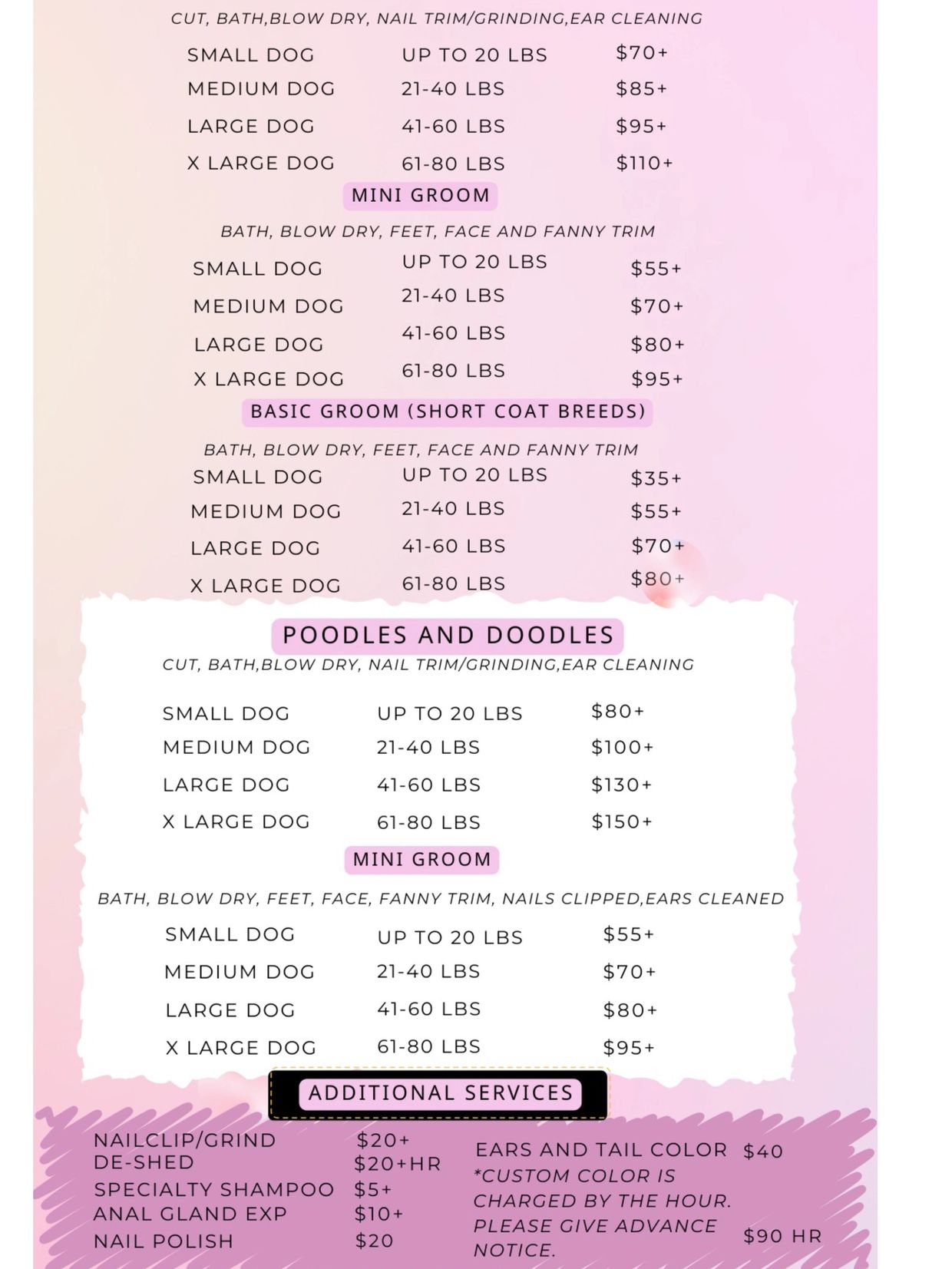 Though I strive to keep to my committed price, it can change depending on dogs behavior and or excessive matting, which both can cause a lot of wear and tear on equipment.